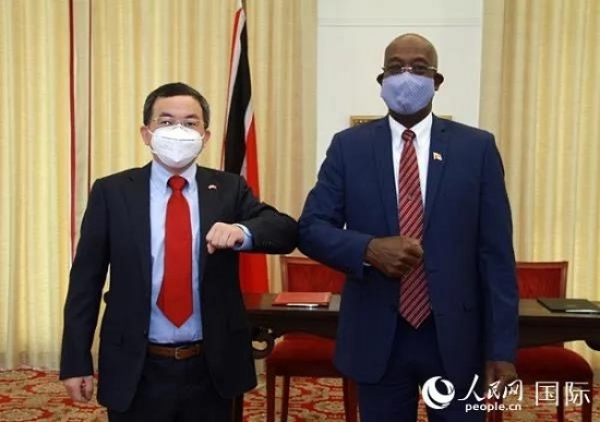 5月19日,特多總理羅利和中國駐特多大使方遒出席中國援助特多新冠疫苗交接儀式。