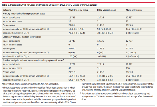 自第二劑注射14天后共檢定出47例無癥狀病例:鋁佐劑組21例,WIV04組16例,HB02組10例。將這些無癥狀病例納入主要分析集后,則WIV04疫苗的預(yù)估保護(hù)效力為64.0%(95%CI,48.8%-74.7%),HB02疫苗的預(yù)估保護(hù)效力為73.5%(95%CI,60.6%-82.2%)。