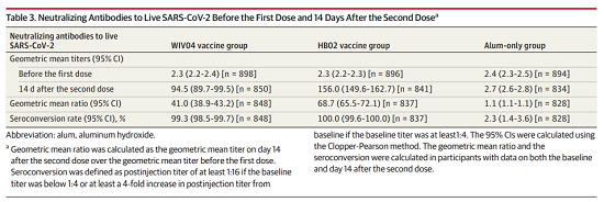 在免疫原性研究中,基線時(shí)中和抗體幾何平均滴度(GMTs)在兩個(gè)疫苗組均為2.3,鋁佐劑組為2.4,第二劑接種14天的GMTs在WIV04組中為94.5(95%CI,89.7-99.5),在HB02組中為156.0(95%CI,149.6-162.7),鋁佐劑組為2.7(95%CI,2.6-2.8)。WIV04組、HB02組和鋁佐劑組的血清陽轉(zhuǎn)率(4倍增長(zhǎng))分別為99.3%、100.0%和2.3%。