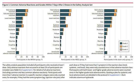 安全性方面,每劑次接種后7天內(nèi),WIV04組有5957人(44.2%)、HB02組有5623人(41.7%)、鋁佐劑組有6250人(46.5%)報(bào)告了不良事件。三組報(bào)告的最常見的不良事件是注射部位疼痛(24.3%、19.4%、27.9%),其次是頭痛(12.9%、13.1%、12.6%)。大多數(shù)不良事件為輕度(1級(jí)或2級(jí)),具有一過性和自限性,不需要特殊治療。接種后8-28天,非征集不良事件發(fā)生率WIV04組、HB02組和鋁佐劑組分別為16.1%、15.5%和15.4%。