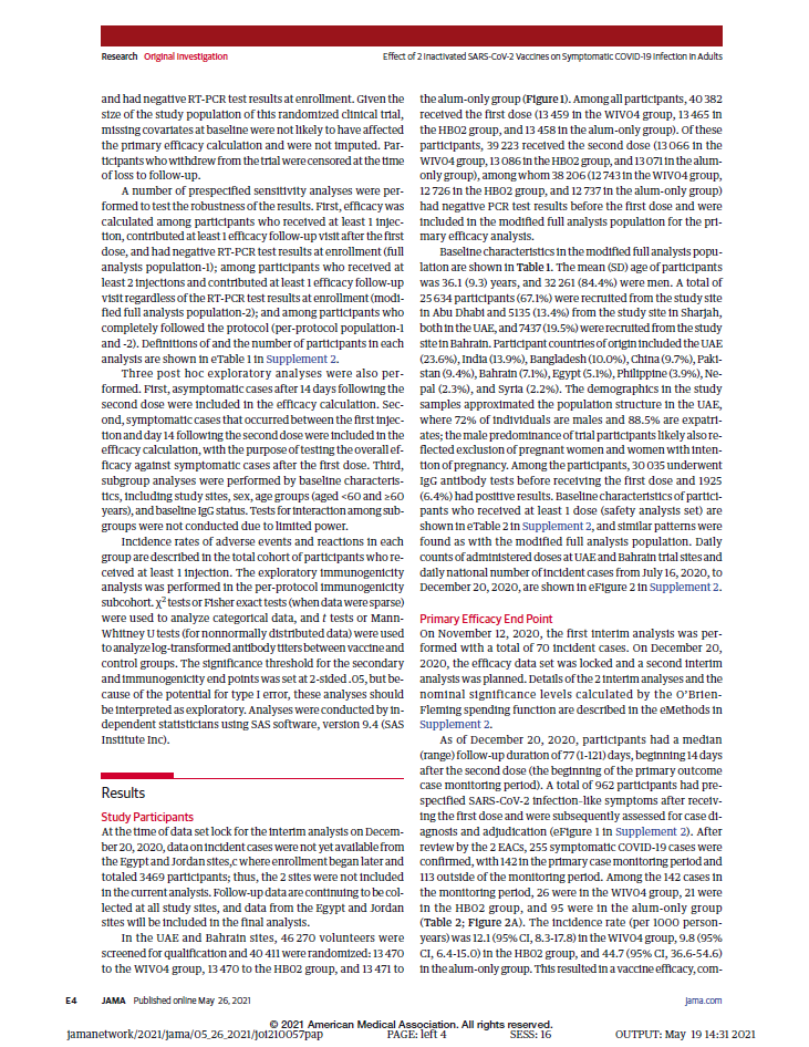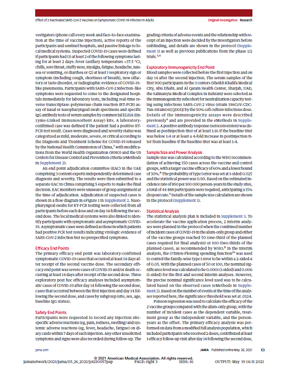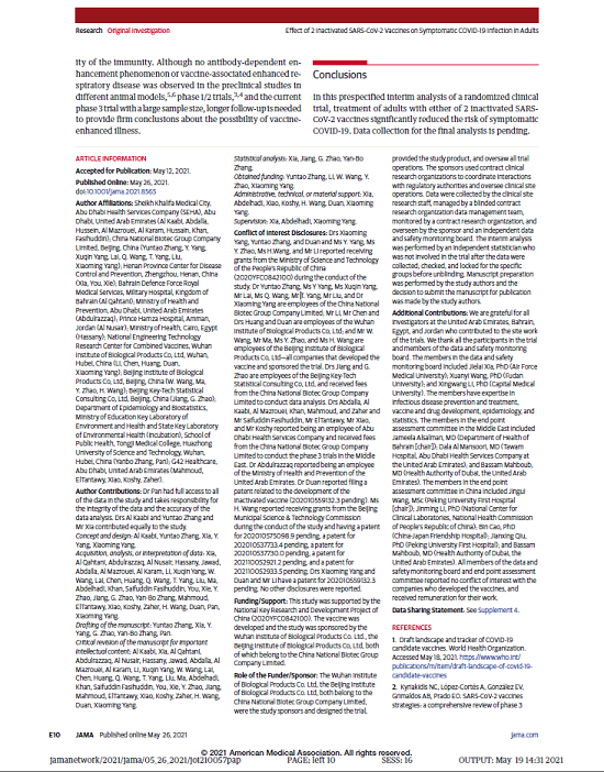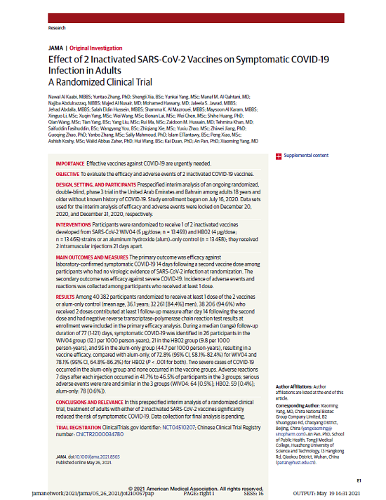 報(bào)告由國(guó)藥集團(tuán)中國(guó)生物、國(guó)家聯(lián)合疫苗工程技術(shù)研究中心、武漢生物制品研究所、北京生物制品研究所、阿聯(lián)酋阿布扎比衛(wèi)生服務(wù)公司(SEHA)謝赫·哈利法醫(yī)療城、巴林王國(guó)軍事醫(yī)院、阿聯(lián)酋衛(wèi)生和預(yù)防部、約旦安曼哈姆扎王子醫(yī)院、埃及衛(wèi)生部、河南省疾病預(yù)防控制中心、北京科特統(tǒng)計(jì)咨詢有限公司、華中科技大學(xué)、G42等多家機(jī)構(gòu)和單位合作完成。報(bào)告于2021年3月17日提交至《JAMA》進(jìn)行編審。
