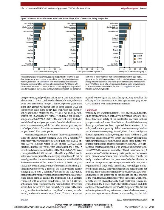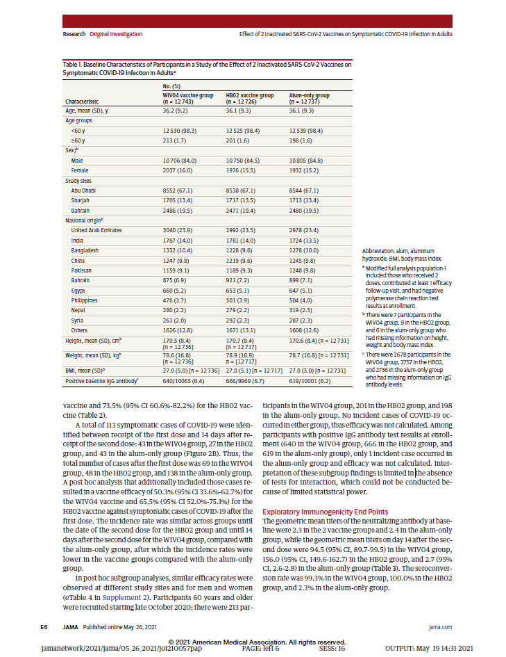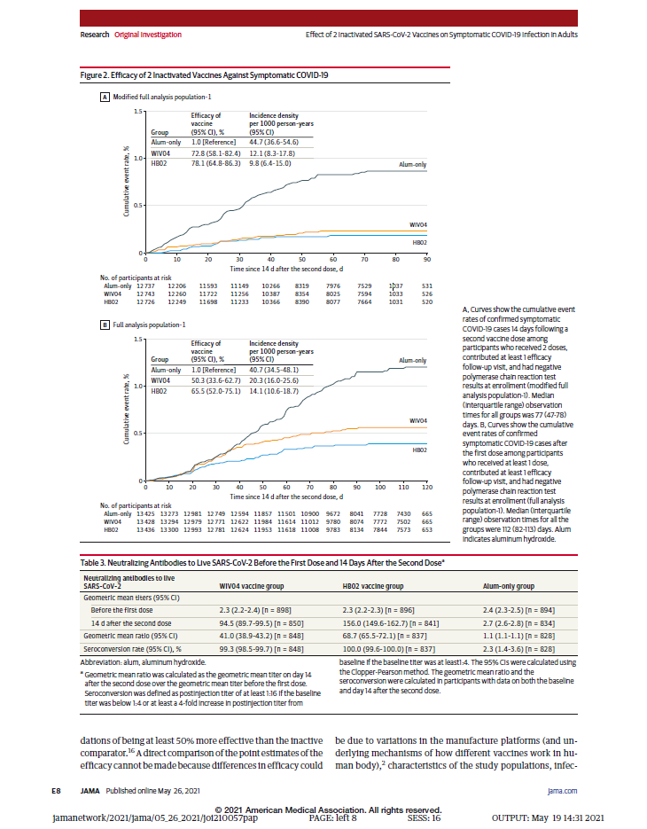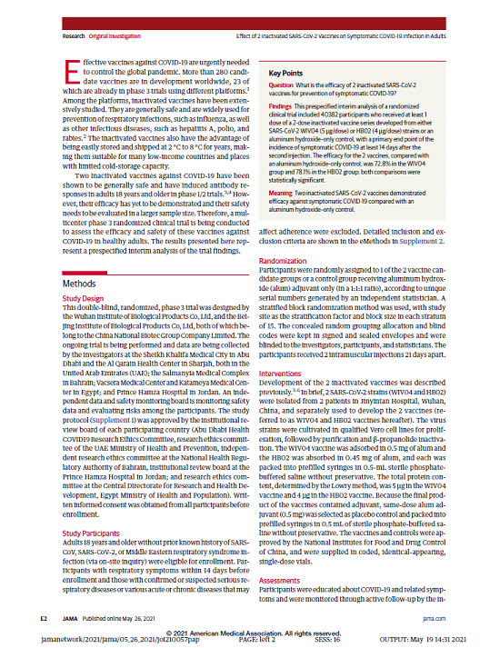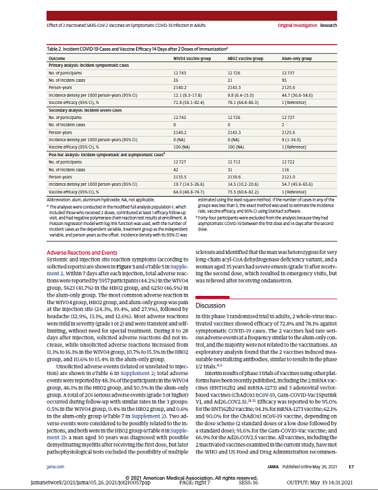 5月26日,國(guó)際醫(yī)學(xué)期刊《美國(guó)醫(yī)學(xué)會(huì)雜志》(TheJournaloftheAmericanMedicalAssociation,JAMA,IF45.54)刊登了國(guó)藥集團(tuán)中國(guó)生物發(fā)表的《兩種新型冠狀病毒滅活疫苗對(duì)成人COVID-19感染的保護(hù)效力評(píng)價(jià)》(“Effectof2InactivatedSARS-CoV-2VaccinesonSymptomaticCOVID-19InfectioninAdults”)。報(bào)告依據(jù)中國(guó)生物新冠滅活疫苗Ⅲ期臨床試驗(yàn)結(jié)果,總結(jié)分析了中國(guó)生物所屬北京生物制品研究所(BIBP)、武漢生物制品研究所(WIBP)新冠滅活疫苗的有效性、安全性等Ⅲ期臨床試驗(yàn)結(jié)果。