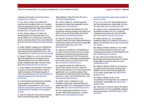 本項(xiàng)研究結(jié)果針對(duì)中國(guó)生物兩款新冠滅活疫苗隨機(jī)、雙盲、安慰劑對(duì)照的Ⅲ期臨床試驗(yàn)開展的中期分析。自2020年7月16日起,40411名受試者入組并隨機(jī)分為三組,分別為鋁佐劑組、新冠疫苗WIV04組和新冠疫苗HB02組。受試者在第0天和第21天接受兩次肌肉注射。自第二劑接種后14天,累計(jì)確診142例有效病例(鋁佐劑組95例,WIV04組26例,HB02組21例),兩種疫苗組有效率分別為72.8%和78.1%(均P<.001)。鋁佐劑組出現(xiàn)2例重癥病例,兩個(gè)疫苗組均未出現(xiàn)重癥病例。接種后7天總不良反應(yīng)發(fā)生率在鋁佐劑組為46.5%,WIV04組為44.2%,HB02組為41.7%。嚴(yán)重不良事件在三組無顯著性差異。在兩個(gè)疫苗組中血清陽轉(zhuǎn)率均高于99.0%(與基線相比中和抗體滴度至少增加4倍),而在鋁佐劑組中為2.3%。目前,該研究仍在進(jìn)行中,長(zhǎng)期保護(hù)性和安全性仍在評(píng)估中。