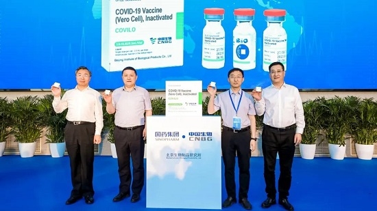 國(guó)藥集團(tuán)董事長(zhǎng)劉敬楨、副總經(jīng)理董增賀,工信部消費(fèi)品司副司長(zhǎng)張曉峰、國(guó)務(wù)院國(guó)資委科創(chuàng)局副局長(zhǎng)柳長(zhǎng)森共同為剛剛下線(xiàn)的供應(yīng)COVAX的中國(guó)新冠疫苗揭幕。中國(guó)生物黨委書(shū)記、副總裁朱京津發(fā)表了熱情洋溢的致辭。