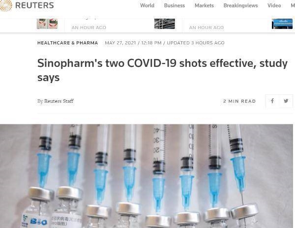路透社報(bào)道稱,周三發(fā)表在《美國醫(yī)學(xué)會雜志》(Journal of the American Medical Association)上的一項(xiàng)同行評議研究顯示,根據(jù)中期結(jié)果,中國國藥集團(tuán)的兩種新冠疫苗的保護(hù)效力均超過70%。