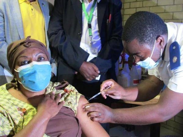 3月19日,納米比亞衛(wèi)生部副部長埃絲特·烏特尤亞·穆因詹吉作為該國首名新冠疫苗接種者在溫得和克接種疫苗。新華社發(fā)(卡薩克攝)