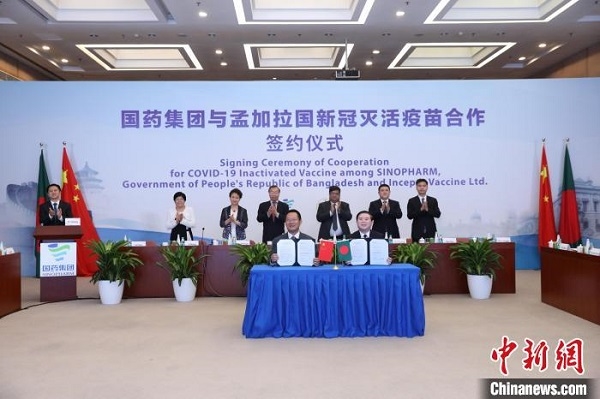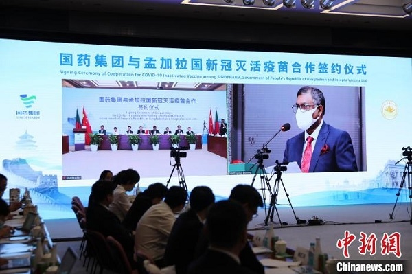 中新網(wǎng)北京8月16日電 (記者 李純)中國(guó)國(guó)藥集團(tuán)與孟加拉國(guó)新冠滅活疫苗合作簽約儀式16日在北京、達(dá)卡兩地以視頻方式舉行。中國(guó)國(guó)藥集團(tuán)所屬國(guó)藥國(guó)際、中國(guó)生物與孟加拉國(guó)衛(wèi)生和家庭福利部三方共同簽署新冠滅活疫苗分裝合作備忘錄,邁出了中孟兩國(guó)合作抗疫新步伐。