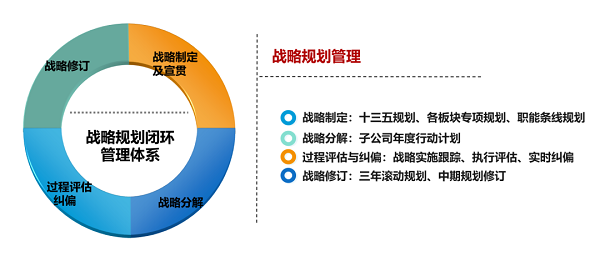 貫徹落實(shí)規(guī)劃目標(biāo)任務(wù)不搖擺、不徘徊,一以貫之、堅(jiān)定不移。建立戰(zhàn)略規(guī)劃閉環(huán)管理體系,將戰(zhàn)略分解為業(yè)務(wù)板塊專項(xiàng)規(guī)劃、職能條線規(guī)劃和子公司行動計(jì)劃,并實(shí)施戰(zhàn)略落實(shí)跟蹤,建立過程評估與糾偏體系,確保規(guī)劃落實(shí)既有剛性,也有彈性。通過將戰(zhàn)略規(guī)劃與績效管理、職務(wù)薪酬掛鉤,明確落實(shí)責(zé)任機(jī)制,實(shí)現(xiàn)戰(zhàn)略規(guī)劃的可監(jiān)督、可考核、可量化。
