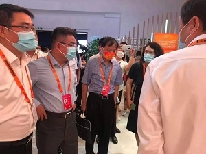 9月2日晚,峰會(huì)開始前,韓正和胡春華、蔡奇等領(lǐng)導(dǎo)同志視察服貿(mào)會(huì)展館。國藥集團(tuán)黨委書記、董事長劉敬楨(下圖左1)作為參展企業(yè)負(fù)責(zé)人向中央領(lǐng)導(dǎo)同志進(jìn)行專題匯報(bào),并且作為唯一企業(yè)代表,全程陪同中央領(lǐng)導(dǎo)同志巡館。