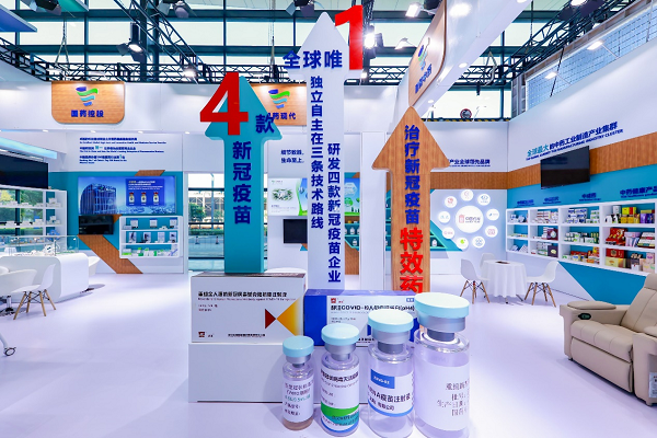 重頭戲的生物制藥領(lǐng)域,國(guó)藥集團(tuán)中國(guó)生物展出了3款檢測(cè)試劑盒、4款新冠疫苗和2款治療新冠肺炎的特效藥物。