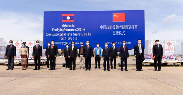 當(dāng)?shù)貢r(shí)間10月13日,中國政府援助老撾的第六批國藥新冠疫苗運(yùn)抵萬象瓦岱國際機(jī)場。老撾人民革命黨中央政治局委員、政府副總理、新冠疫情防控委員會(huì)主任吉喬,衛(wèi)生部長本貢,以及中國駐老撾大使姜再冬等人到場迎接。