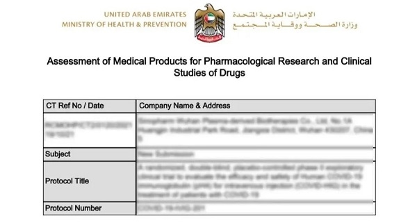 阿聯(lián)酋衛(wèi)生部頒發(fā)的臨床試驗(yàn)批準(zhǔn)文件