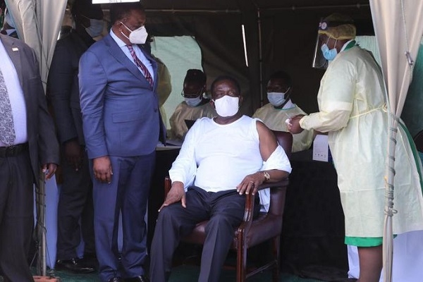 2021年3月24日,津巴布韋總統(tǒng)姆南加古瓦(中)在維多利亞瀑布城準(zhǔn)備接種新冠疫苗。新華社發(fā)(陳雅琴 攝)