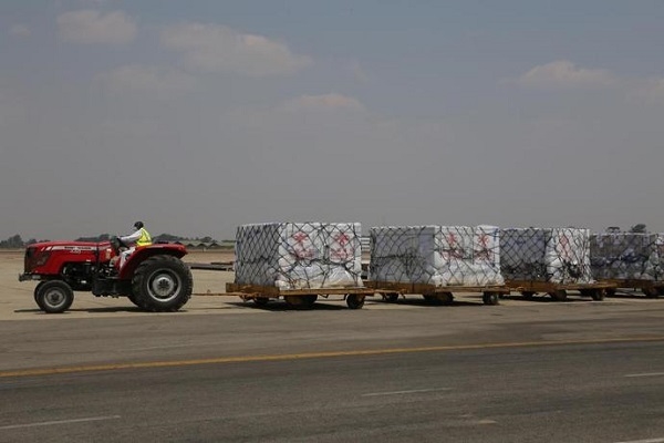 2021年9月26日,工作人員在津巴布韋首都哈拉雷的羅伯特·穆加貝國際機(jī)場(chǎng)轉(zhuǎn)運(yùn)中國援助的新冠疫苗。當(dāng)天下午,中國援助津巴布韋的第四批新冠疫苗運(yùn)抵首都哈拉雷。新華社發(fā)(陳雅琴 攝)