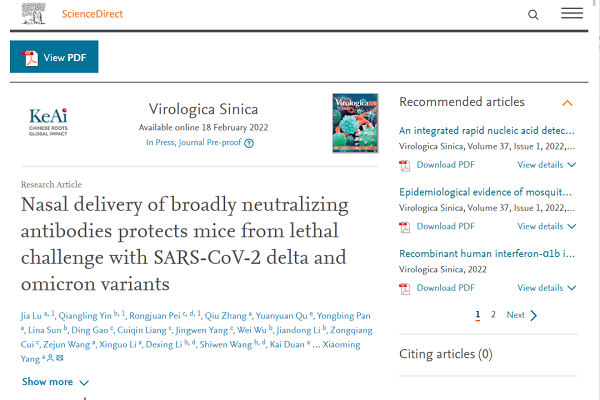 研究成果在ScicenceDirect在線發(fā)表了“Nasal delivery of broadly neutralizing antibodies protects mice from lethal challenge with SARS-CoV-2 delta and omicron variants ”(廣譜中和抗體鼻內(nèi)給藥可保護(hù)小鼠免受新冠德爾塔和奧密克戎變異株的致死性攻擊)的文章。