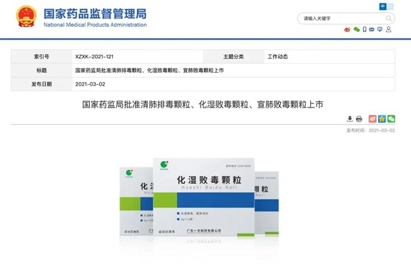 2021年3月,國(guó)家藥品監(jiān)督管理局批準(zhǔn)化濕敗毒顆粒注冊(cè)上市;12月,進(jìn)入國(guó)家醫(yī)保藥品目錄。目前,化濕敗毒顆粒已在阿聯(lián)酋、柬埔寨等國(guó)家獲批上市。化濕敗毒顆粒的上市,是對(duì)中醫(yī)藥在抗擊疫情中取得成果的充分認(rèn)可,彰顯國(guó)藥集團(tuán)在中醫(yī)藥生產(chǎn)研發(fā)領(lǐng)域的領(lǐng)軍實(shí)力和促進(jìn)中醫(yī)藥傳承創(chuàng)新發(fā)展方面的顯著成效。