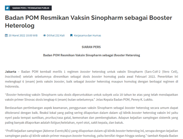 BPOM發(fā)布的“批準(zhǔn)國(guó)藥集團(tuán)中國(guó)生物疫苗作為異源加強(qiáng)針”的公告