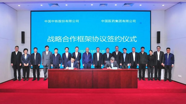 會談結束后,雙方舉行戰(zhàn)略合作框架協(xié)議簽約儀式,中國中鐵副總裁于騰群、國藥集團副總經(jīng)理鄧金棟代表雙方簽約。中國中鐵董事長陳云、國藥集團董事長劉敬楨及雙方總部相關部門及子企業(yè)負責人見證簽約。
