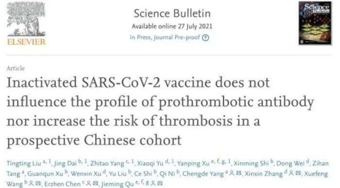 2021年8月,國際權(quán)威自然科學(xué)綜合性學(xué)術(shù)刊物Science Bulletin(科學(xué)通報(bào),影響因子IF:11.780),發(fā)表的一項(xiàng)旨在探索新冠滅活疫苗是否會促進(jìn)血栓相關(guān)自身抗體的產(chǎn)生及是否會增加接種后血栓事件風(fēng)險(xiǎn)的前瞻性研究成果表明,國藥集團(tuán)中國生物新冠滅活疫苗無發(fā)生血栓風(fēng)險(xiǎn)。