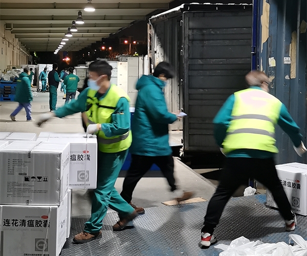 4月2日晚10點(diǎn),20余輛藥品配送車載滿首批共計2萬件、800萬盒連花清瘟膠囊,抵達(dá)位于上??祵幝返膰幬锪鱾}儲庫區(qū)。早已在這里做好準(zhǔn)備的國藥物流人員迅速開始卸貨、入庫、轉(zhuǎn)運(yùn)。4月3日凌晨,這批連花清瘟藥品已陸續(xù)送往浦東、楊浦等區(qū)的醫(yī)療機(jī)構(gòu)和社區(qū)衛(wèi)生服務(wù)中心,緩解當(dāng)前的燃眉之急。