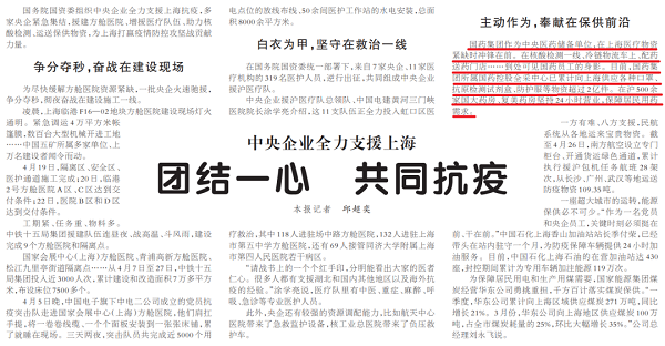 國(guó)務(wù)院國(guó)資委組織中央企業(yè)全力支援上??挂撸嗉已肫缶o急集結(jié),援建方艙醫(yī)院、增援醫(yī)療隊(duì)伍、助力核酸檢測(cè)、運(yùn)送保供物資,為上海打贏疫情防控攻堅(jiān)戰(zhàn)貢獻(xiàn)力量。