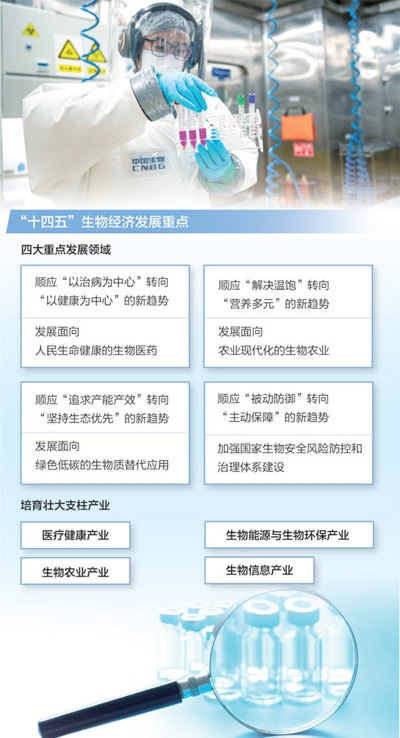 日前,《“十四五”生物經(jīng)濟(jì)發(fā)展規(guī)劃》(以下簡(jiǎn)稱《規(guī)劃》)正式印發(fā)。作為我國(guó)首部生物經(jīng)濟(jì)五年規(guī)劃,《規(guī)劃》提出加快發(fā)展生物技術(shù)和生物產(chǎn)業(yè),讓生物經(jīng)濟(jì)成為推動(dòng)高質(zhì)量發(fā)展的強(qiáng)勁動(dòng)力,明確要培育壯大醫(yī)療健康、生物農(nóng)業(yè)、生物能源與生物環(huán)保、生物信息等支柱產(chǎn)業(yè)。生物經(jīng)濟(jì)支柱產(chǎn)業(yè)前景如何,怎樣培育壯大?記者對(duì)相關(guān)企業(yè)和專家進(jìn)行了采訪。