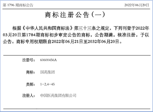 近日,國(guó)藥集團(tuán)核心品牌——“國(guó)藥集團(tuán)”“中國(guó)生物”文字,取得國(guó)家知識(shí)產(chǎn)權(quán)局商標(biāo)局審定并發(fā)布的商標(biāo)核準(zhǔn)注冊(cè)公告,標(biāo)志著國(guó)藥集團(tuán)品牌建設(shè)工作取得又一標(biāo)志性成果。