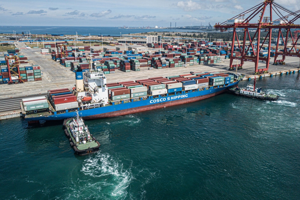一艘中遠海運集裝箱貨輪在兩艘拖輪的輔助下,靠泊進海南洋浦小鏟灘碼頭。記者 蒲曉旭 攝