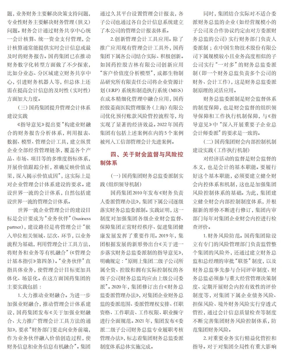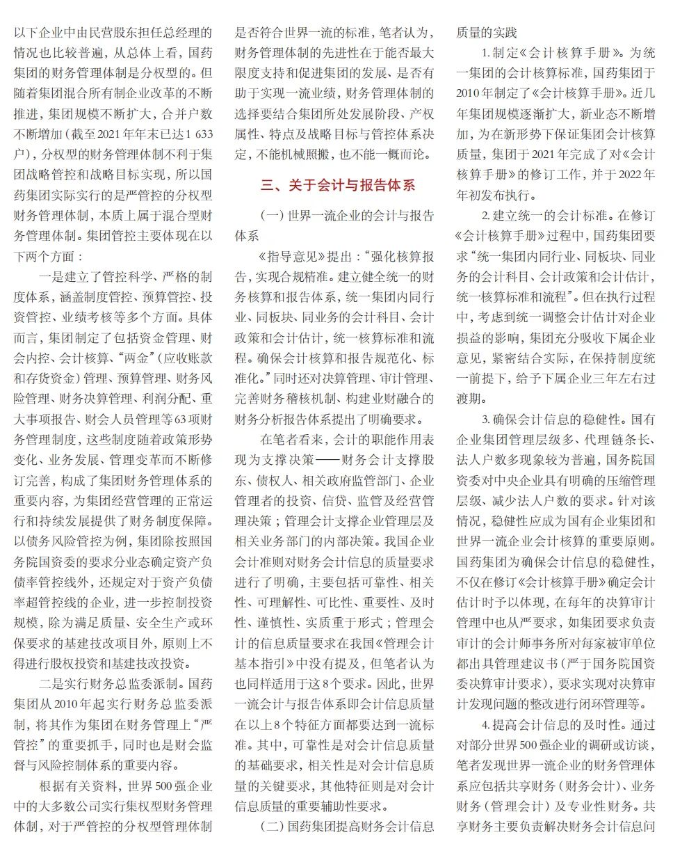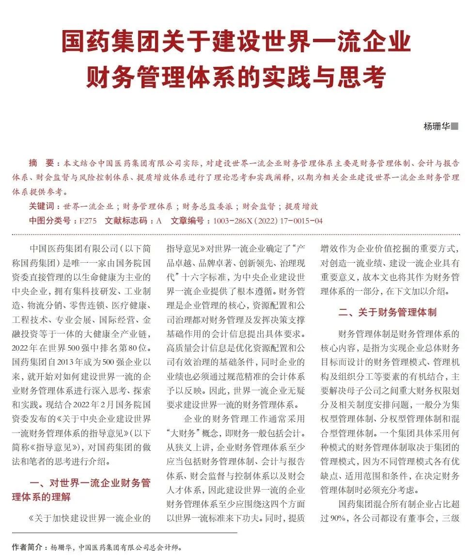2022年2月,國務院國資委發(fā)布《關于中央企業(yè)加快建設世界一流財務管理體系的指導意見》,為中央企業(yè)進一步提升財務管理水平提供了具體指引和行動指南。中國醫(yī)藥集團有限公司(以下簡稱國藥集團)以建設 世界一流企業(yè)為目標,緊密結合集團管控和業(yè)務實際,構建并不斷優(yōu)化財務管理體制、會計與報告體系、財會監(jiān)督與風險控制體系,創(chuàng)新并持續(xù)完善獨具特色的提質增效工作體系,取得了積極的成效。集團從“大財務”概念出發(fā),結合自身實際,對如何建設世界一流財務管理體系進行理論思考與實踐闡釋;搭建并完善與集團相匹配的會計核算體系、會計制度管理體系、管理會計體系、會計信息質量整改體系和會計信息質量監(jiān)督評價體系,不斷完善會計體系建設;針對集團應收賬款占比大的特點,以“全流程、全節(jié)點、精細化、科學化”管控為核心原則,從“事前、事中、事后”全方位管控應收賬款,通過完善資信一體化平臺建設、建立客戶價值度分析模型、設置應收賬款專職管理機構及提升信息化管控手段等方式不斷提高應收賬款精細化管理水平;秉持“財務創(chuàng)造價值”理念,不斷強化業(yè)財融合,創(chuàng)新管理會計工具應用,在進一步實現醫(yī)藥返利精準、高效核算的同時,細化返利管理顆粒度,加速返利回收;通過財務總監(jiān)委派制不斷強化對下屬企業(yè)的財會監(jiān)督,加強財務管理,有效防范企業(yè)經營風險和財務風險;在對提質增效的理論依據和邏輯進行認真分析的基礎上,持續(xù)推動并完善提質增效項目制,以黨建引領作保障、以目標激勵促落實 , 確保提質增效做實做細取得實效。國藥集團開展的一系列務實、創(chuàng)新的財務管理體系建設實踐對助力集團高質量發(fā)展和創(chuàng)建世界一流企業(yè)發(fā)揮了重要作用, 希望能為相關企業(yè)集團加強財務管控和建設財務管理體系提供參考和借鑒。