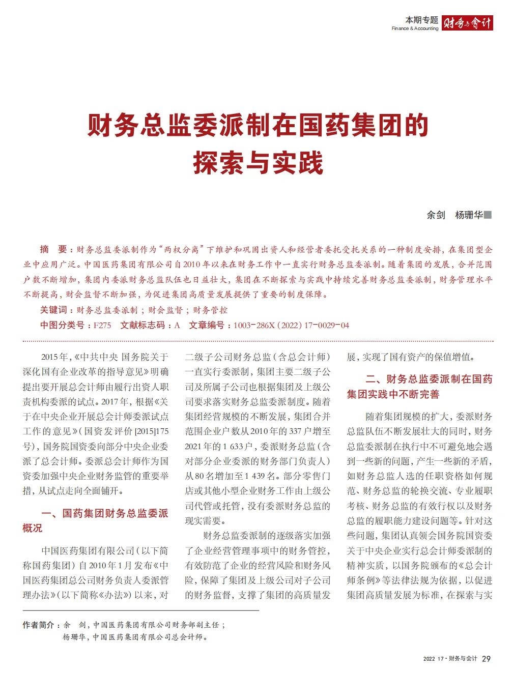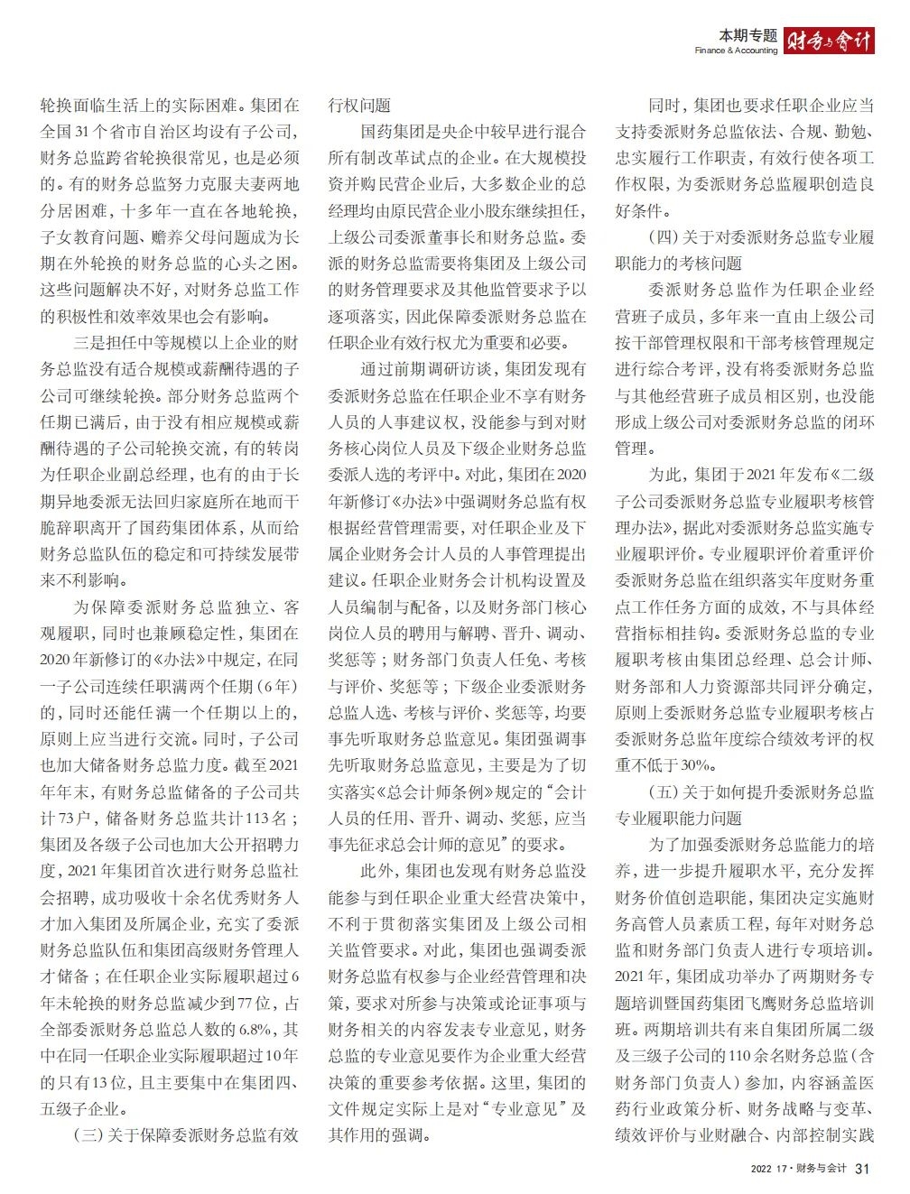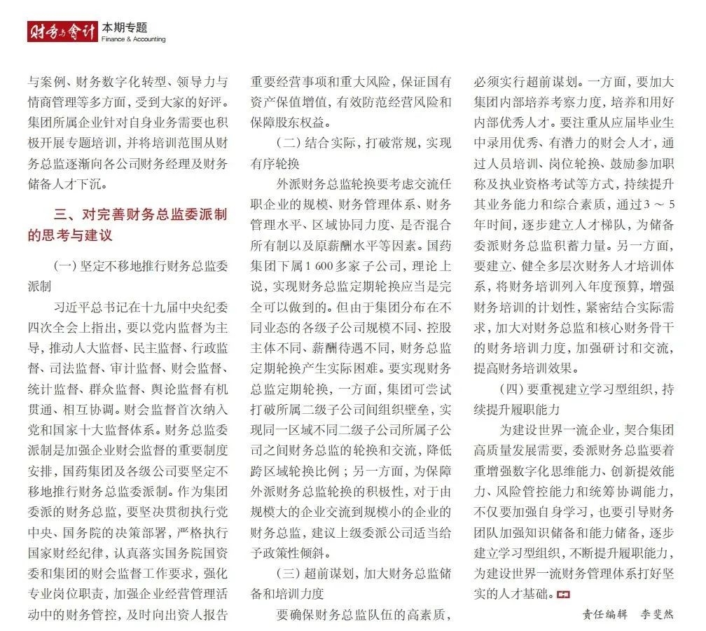 2022年2月,國務(wù)院國資委發(fā)布《關(guān)于中央企業(yè)加快建設(shè)世界一流財務(wù)管理體系的指導(dǎo)意見》,為中央企業(yè)進一步提升財務(wù)管理水平提供了具體指引和行動指南。中國醫(yī)藥集團有限公司(以下簡稱國藥集團)以建設(shè) 世界一流企業(yè)為目標,緊密結(jié)合集團管控和業(yè)務(wù)實際,構(gòu)建并不斷優(yōu)化財務(wù)管理體制、會計與報告體系、財會監(jiān)督與風(fēng)險控制體系,創(chuàng)新并持續(xù)完善獨具特色的提質(zhì)增效工作體系,取得了積極的成效。集團從“大財務(wù)”概念出發(fā),結(jié)合自身實際,對如何建設(shè)世界一流財務(wù)管理體系進行理論思考與實踐闡釋;搭建并完善與集團相匹配的會計核算體系、會計制度管理體系、管理會計體系、會計信息質(zhì)量整改體系和會計信息質(zhì)量監(jiān)督評價體系,不斷完善會計體系建設(shè);針對集團應(yīng)收賬款占比大的特點,以“全流程、全節(jié)點、精細化、科學(xué)化”管控為核心原則,從“事前、事中、事后”全方位管控應(yīng)收賬款,通過完善資信一體化平臺建設(shè)、建立客戶價值度分析模型、設(shè)置應(yīng)收賬款專職管理機構(gòu)及提升信息化管控手段等方式不斷提高應(yīng)收賬款精細化管理水平;秉持“財務(wù)創(chuàng)造價值”理念,不斷強化業(yè)財融合,創(chuàng)新管理會計工具應(yīng)用,在進一步實現(xiàn)醫(yī)藥返利精準、高效核算的同時,細化返利管理顆粒度,加速返利回收;通過財務(wù)總監(jiān)委派制不斷強化對下屬企業(yè)的財會監(jiān)督,加強財務(wù)管理,有效防范企業(yè)經(jīng)營風(fēng)險和財務(wù)風(fēng)險;在對提質(zhì)增效的理論依據(jù)和邏輯進行認真分析的基礎(chǔ)上,持續(xù)推動并完善提質(zhì)增效項目制,以黨建引領(lǐng)作保障、以目標激勵促落實 , 確保提質(zhì)增效做實做細取得實效。國藥集團開展的一系列務(wù)實、創(chuàng)新的財務(wù)管理體系建設(shè)實踐對助力集團高質(zhì)量發(fā)展和創(chuàng)建世界一流企業(yè)發(fā)揮了重要作用, 希望能為相關(guān)企業(yè)集團加強財務(wù)管控和建設(shè)財務(wù)管理體系提供參考和借鑒。