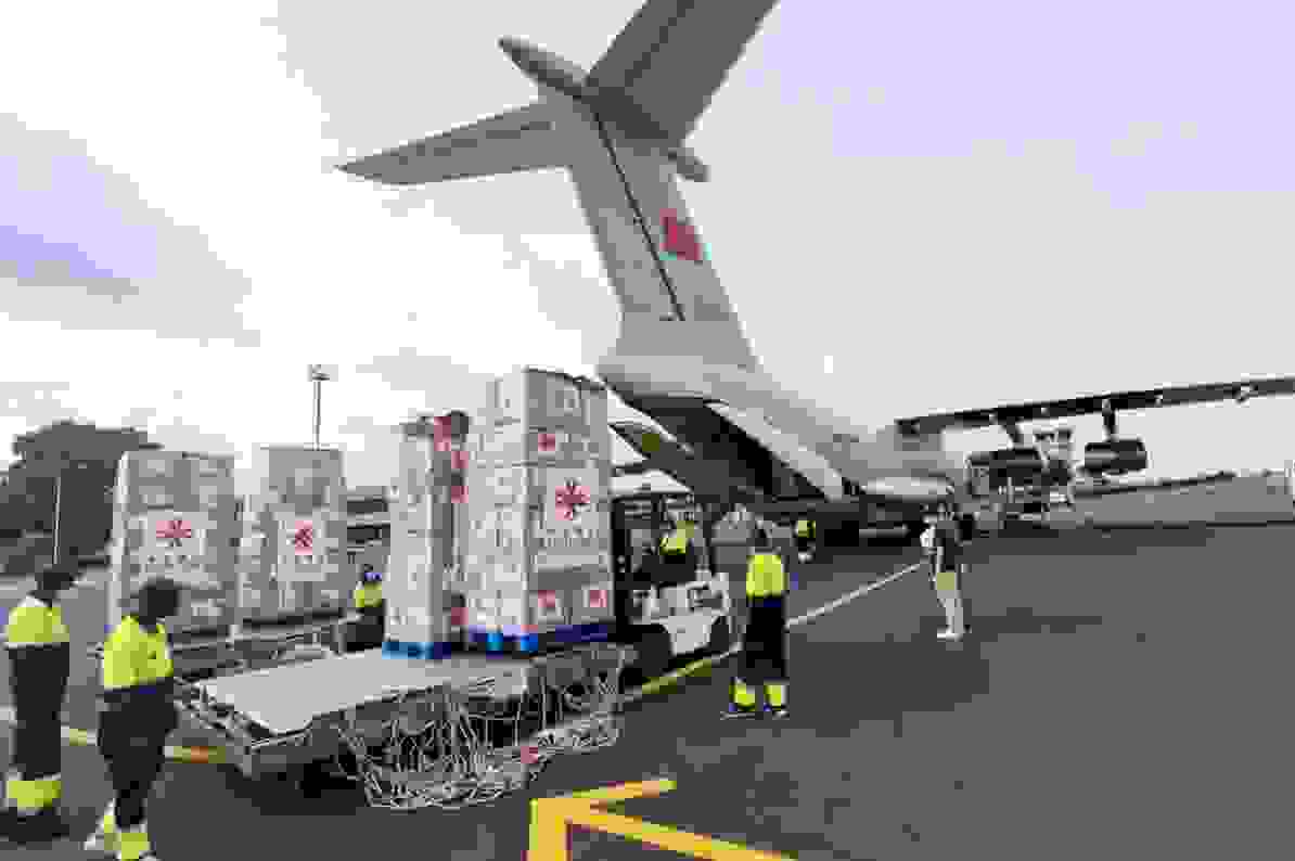 國藥集團(tuán)下屬國藥國際援外執(zhí)行的抗疫物資運(yùn)抵幾內(nèi)亞比紹國際機(jī)場。(央廣網(wǎng)發(fā) 國藥集團(tuán)供圖)