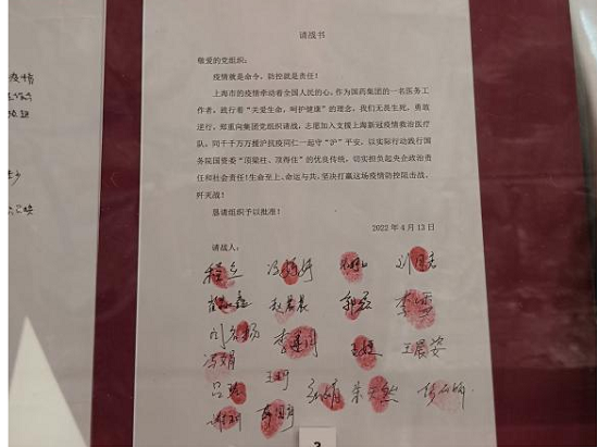 在身穿白色防護(hù)服醫(yī)護(hù)工作者人像的前方展臺(tái)上,展出了國藥集團(tuán)援滬醫(yī)療隊(duì)醫(yī)護(hù)人員的請(qǐng)戰(zhàn)書。三年來,21萬國藥人,不計(jì)代價(jià)、不計(jì)成本、不計(jì)個(gè)人安危,義無反顧赴疫情最嚴(yán)重、防控最需要的崗位,勇敢肩負(fù)起守護(hù)人民生命安全和身體健康的使命職責(zé)。請(qǐng)戰(zhàn)書是新時(shí)代國藥人精神的鮮活體現(xiàn),是國藥集團(tuán)黨組織發(fā)揮戰(zhàn)斗堡壘作用的具體實(shí)踐。