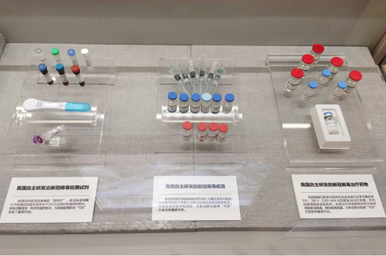 “方寸之間”展位的首排首個(gè)方柜,展出了以國藥集團(tuán)中國生物新冠疫苗、奧密克戎株新冠疫苗為代表的抗病毒藥物,展現(xiàn)了國藥集團(tuán)奮力推進(jìn)科技創(chuàng)新,努力打造“國之重器”的傲人成績。