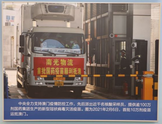 中央綜合展區(qū)第十單元“堅(jiān)持‘一國兩制’ 推進(jìn)祖國統(tǒng)一”澳門篇章,大幅圖片展現(xiàn)了首批10萬劑國藥集團(tuán)新冠疫苗運(yùn)抵澳門的情況,體現(xiàn)了國藥集團(tuán)對(duì)鞏固內(nèi)地和澳門疫情防控成果、加快恢復(fù)澳門經(jīng)濟(jì)社會(huì)正常秩序的重要貢獻(xiàn)。