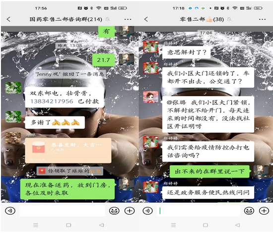 所有零售藥店堅持正常運營,不隨意關(guān)停。門店專門成立了藥品配送小組,在微信上建立了購藥咨詢?nèi)?,每天早晨上班后,根?jù)顧客在群里發(fā)送的用藥需求,及時調(diào)配藥品,下午安排專人統(tǒng)一進(jìn)行配送。