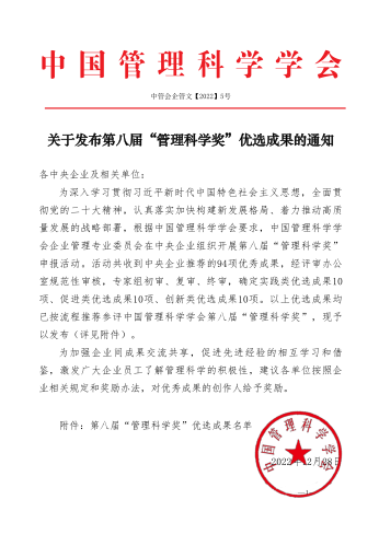 集團(tuán)本次獲得的2項(xiàng)管理科學(xué)獎(jiǎng)及6項(xiàng)優(yōu)選成果,體現(xiàn)了集團(tuán)認(rèn)真落實(shí)加快構(gòu)建新發(fā)展格局、實(shí)施高質(zhì)量發(fā)展戰(zhàn)略,落實(shí)集團(tuán)“十四五”規(guī)劃戰(zhàn)略目標(biāo)、深入推動國企改革取得了實(shí)效。體現(xiàn)了集團(tuán)近年來上下團(tuán)結(jié)一心、攻堅(jiān)克難、銳意進(jìn)取,邁向世界一流企業(yè)的管理能力及水平。