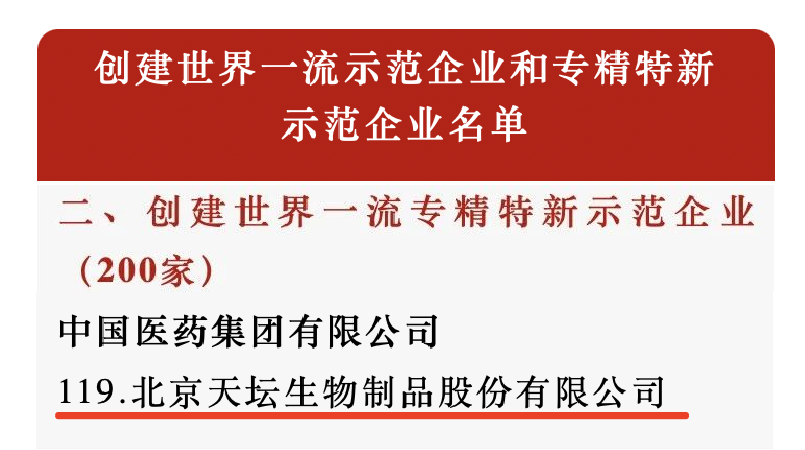 近日,國務(wù)院國資委公布最新“創(chuàng)建世界一流示范企業(yè)和專精特新示范企業(yè)”名單,國藥集團(tuán)北京天壇生物制品股份有限公司入選“創(chuàng)建世界一流專精特新示范企業(yè)”名單,成為全國首批200家世界一流專精特新示范企業(yè)之一。